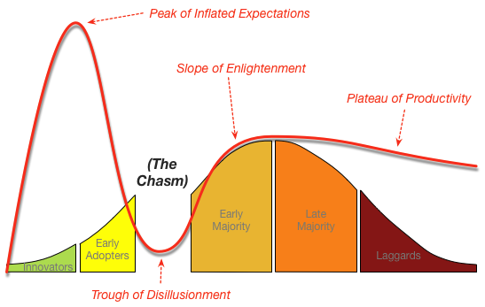 The Gartner Hype Cycle shows what actually happens. The Hype Cycle looks at customer expectations and perception as a technology is introduced and then matures over time.
